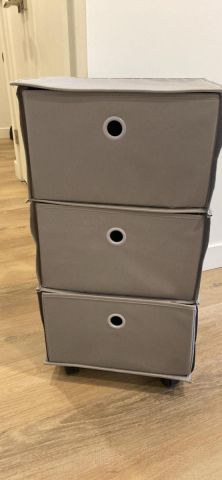 布质的3屉收纳柜,底部有滑轮