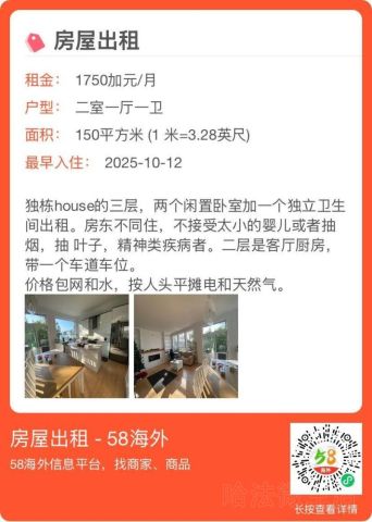 合租随时看房交通便利靠近车站中小学优质学区独立卫浴包网络免佣金查信用天燃气预约看房带家具 1750加币/月2025-10-17
