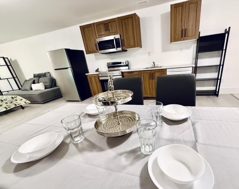共用厨房,冰箱微波炉烤箱齐全,洗衣机、烘干机一应俱全