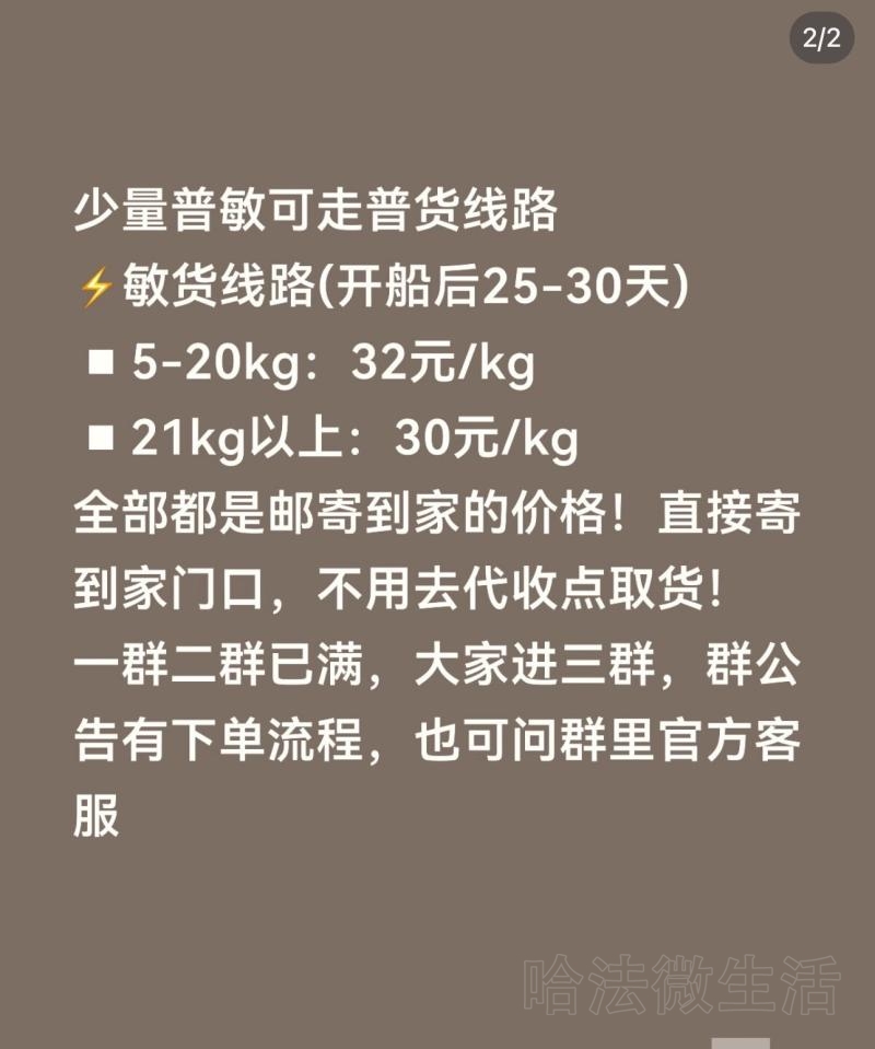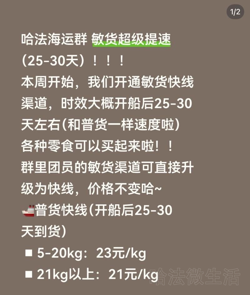 置顶 生活服务 哈法海运群 敏货超级提速(25-30天)!!! 本周开始,我们开通敏货快线渠道,时效大...
